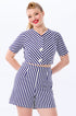 The Cerci Stripe Navy Shorts are a 40’s style striped short, perfect for summer. These shorts are high waisted and button at the side for a beautiful vintage inspired silhouette. Perfect when paired with coordinating bolero.