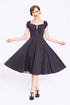 The Dolores Polka Dot Doll Dress is a 1950s inspired swing dress perfect for all vintage and retro fans. Featuring a sweetheart neckline, pleated bust detail with domed buttons and elasticated puff sleeves that can be worn on or off the shoulder. The full skirt lends itself to a petticoat, but is also perfect without