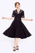 Inspired by the effortless elegance of the 1940s, the Retrova Swing Dress is a timeless statement of classic femininity. Cut in a flowing black fabric, it features contrasting white piping and black front buttons that create a striking vintage finish. The matching belt defines the waist beautifully, while the full swing skirt moves gracefully with every step.